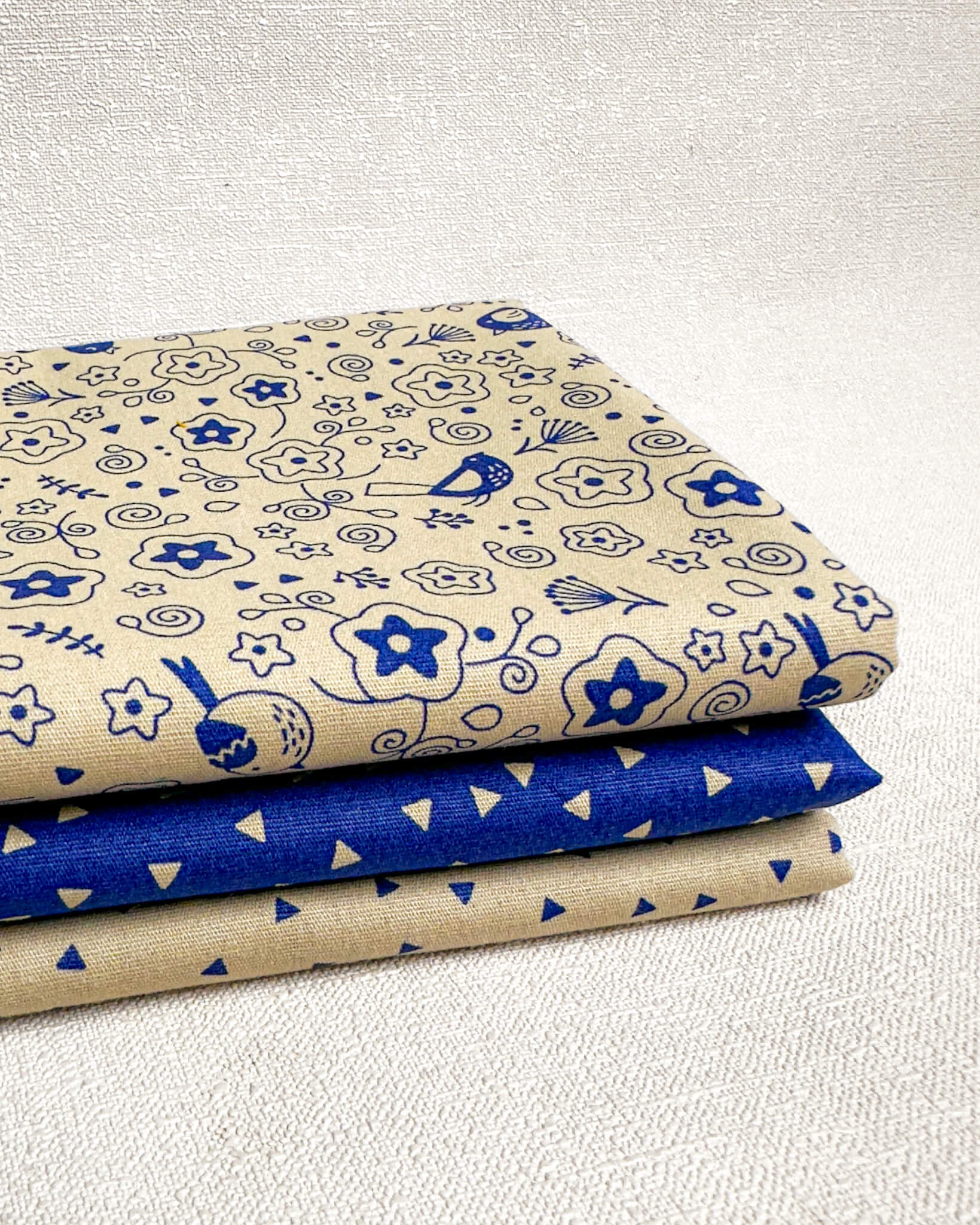Este conjunto reúne três cortes de tricoline 100% algodão em tons de azul e cru, pensados para funcionar juntos de forma harmônica. As estampas se conectam: triângulos em contraste no azul, triângulos invertidos no fundo cru e uma estampa de pássaros e flores que equilibra e amarra toda a composição.