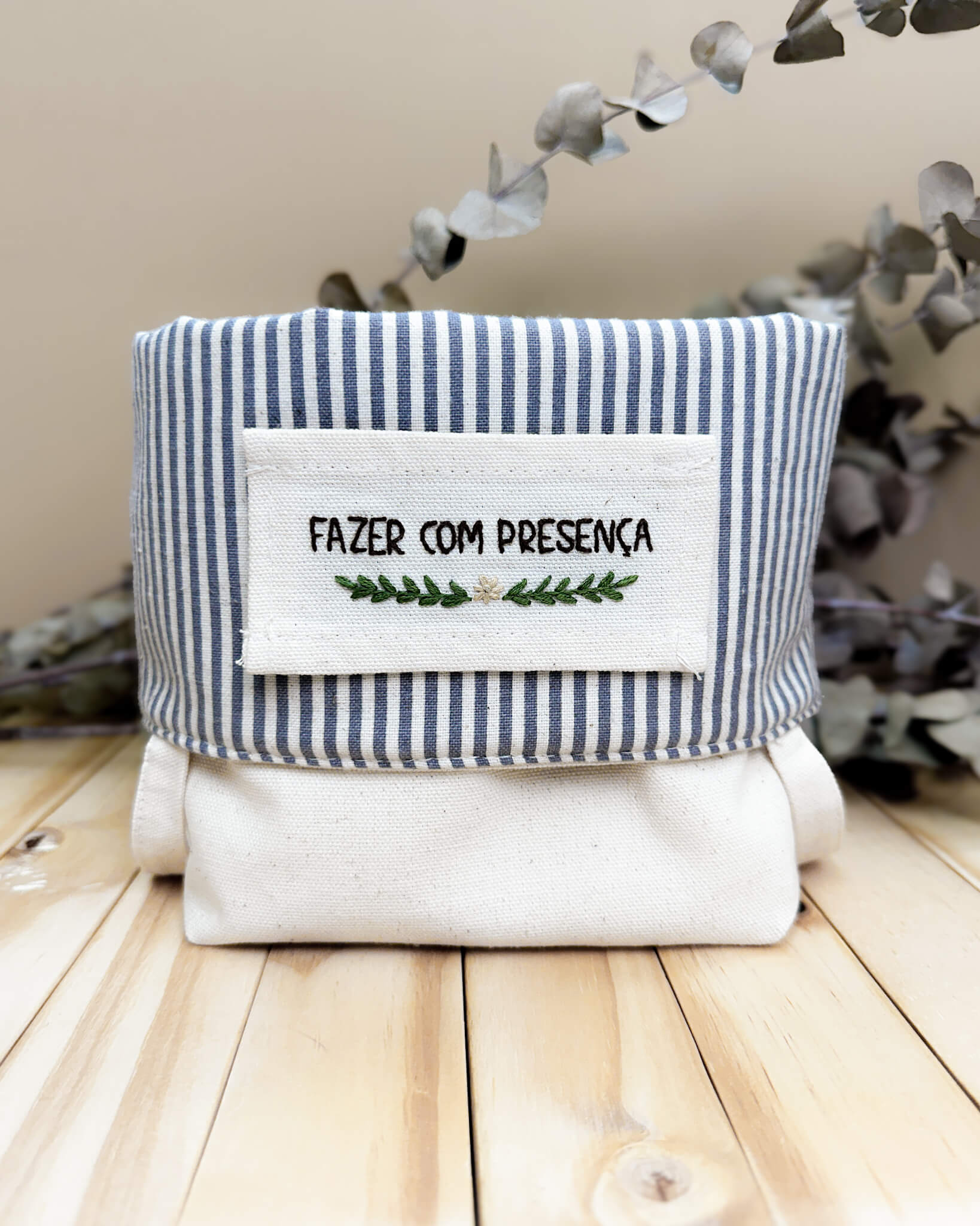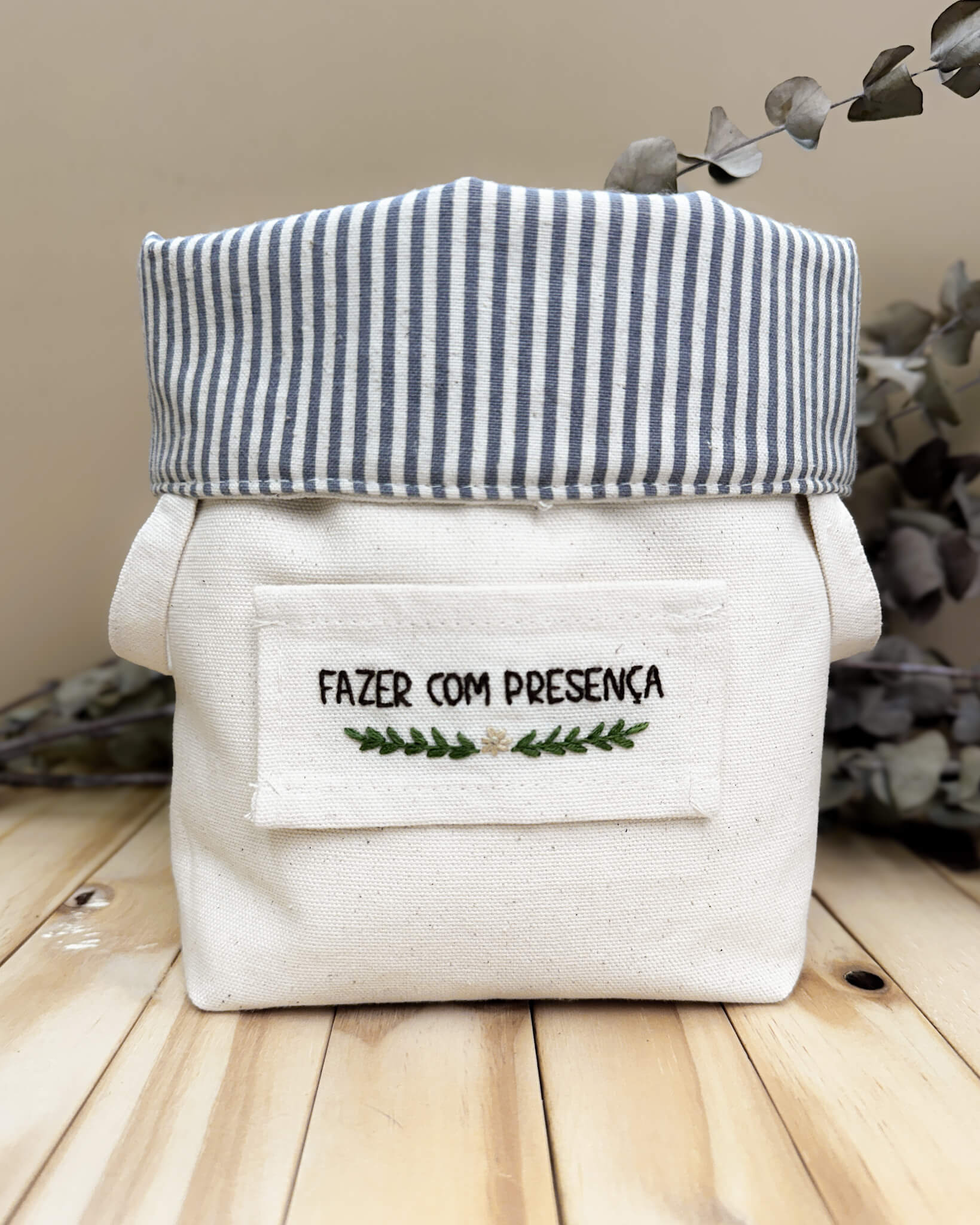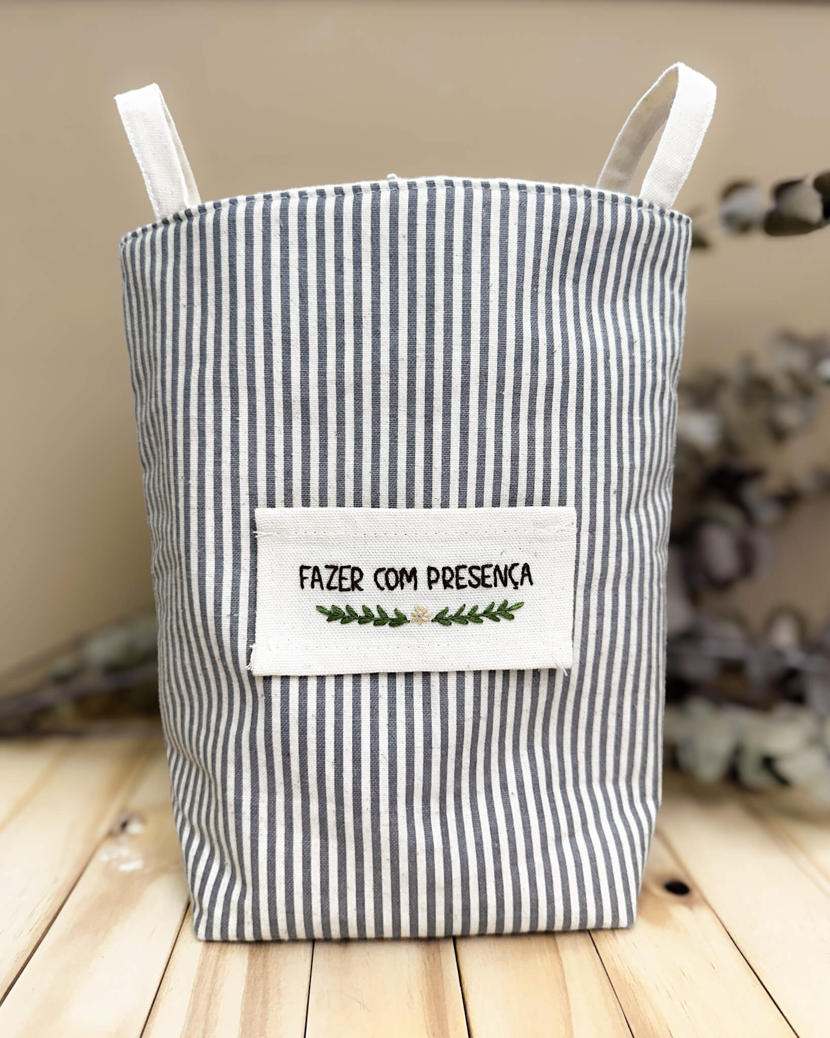 Cada cesta acompanha uma etiqueta de tecido 5x10cm já finalizada, pensada especialmente para o bordado. Você pode bordar com calma e depois costurar onde fazer mais sentido, transformando a peça em algo único. O passo a passo impresso acompanha o produto.
