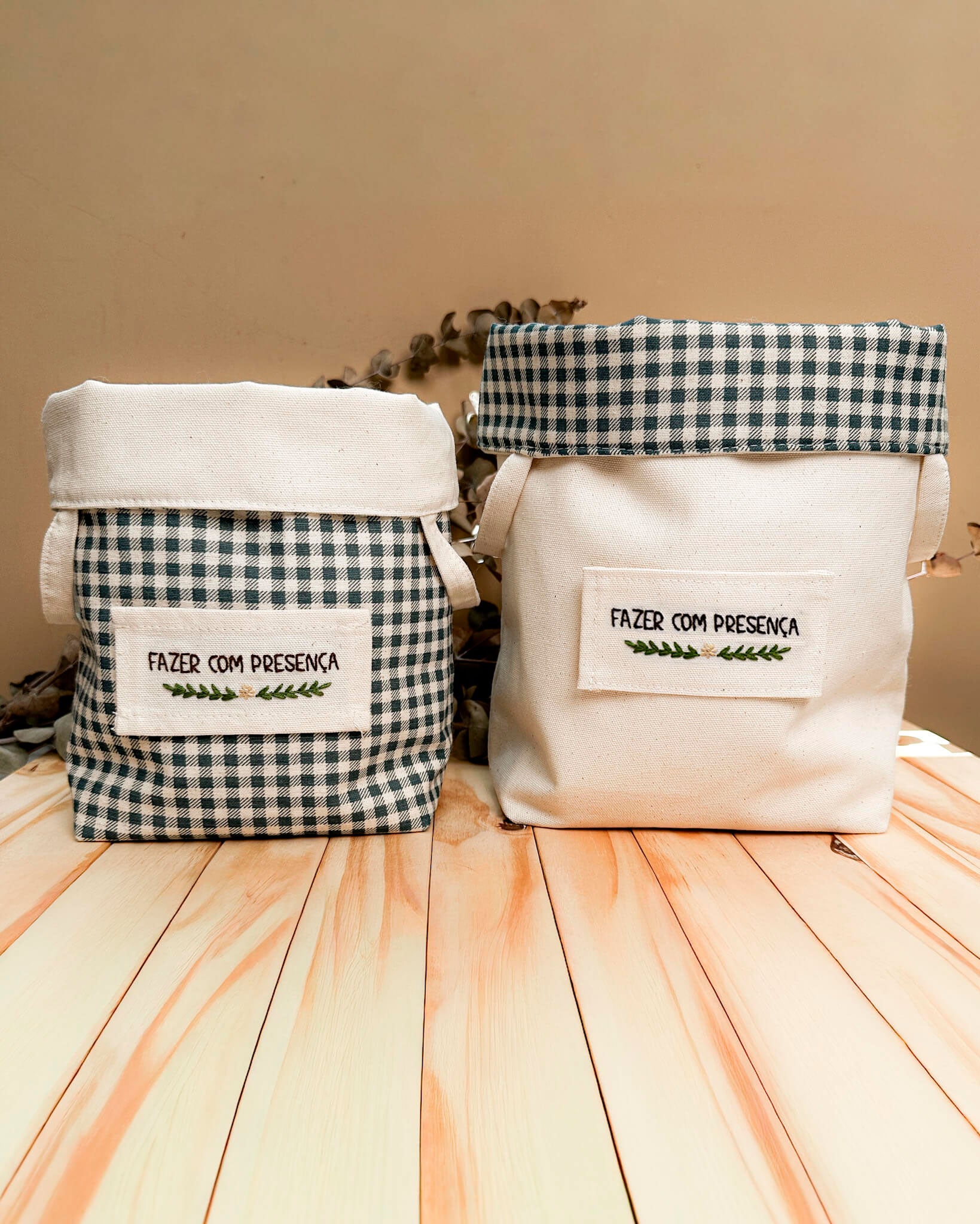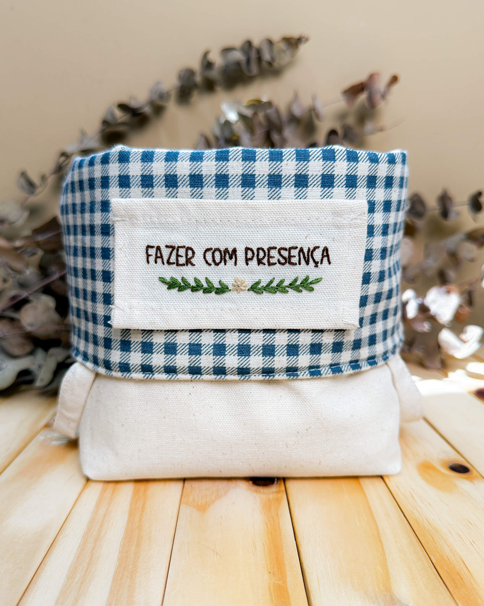 Cada cesta acompanha uma etiqueta de tecido 5x10cm já finalizada, pensada especialmente para o bordado. Você pode bordar com calma e depois costurar onde fazer mais sentido, transformando a peça em algo único. O passo a passo impresso acompanha o produto.