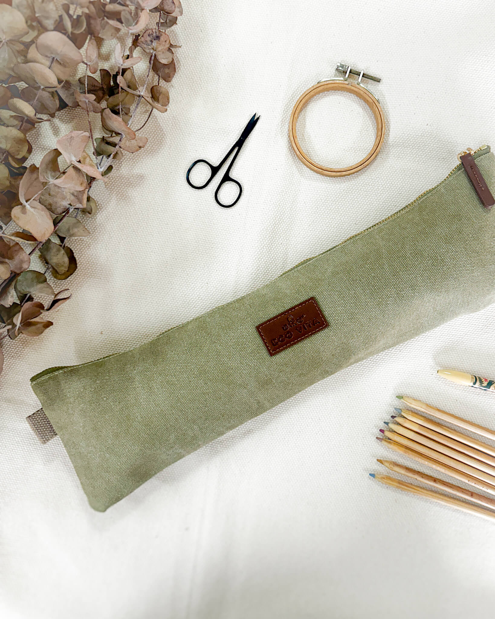 Com fechamento em zíper e formato slim, ele acomoda ferramentas essenciais sem ocupar muito espaço na bolsa ou na mesa. O tecido em lona reciclada traz leveza e resistência, enquanto a etiqueta em couro sintético com o logo Eco Vita em relevo finaliza o design com um toque artesanal.