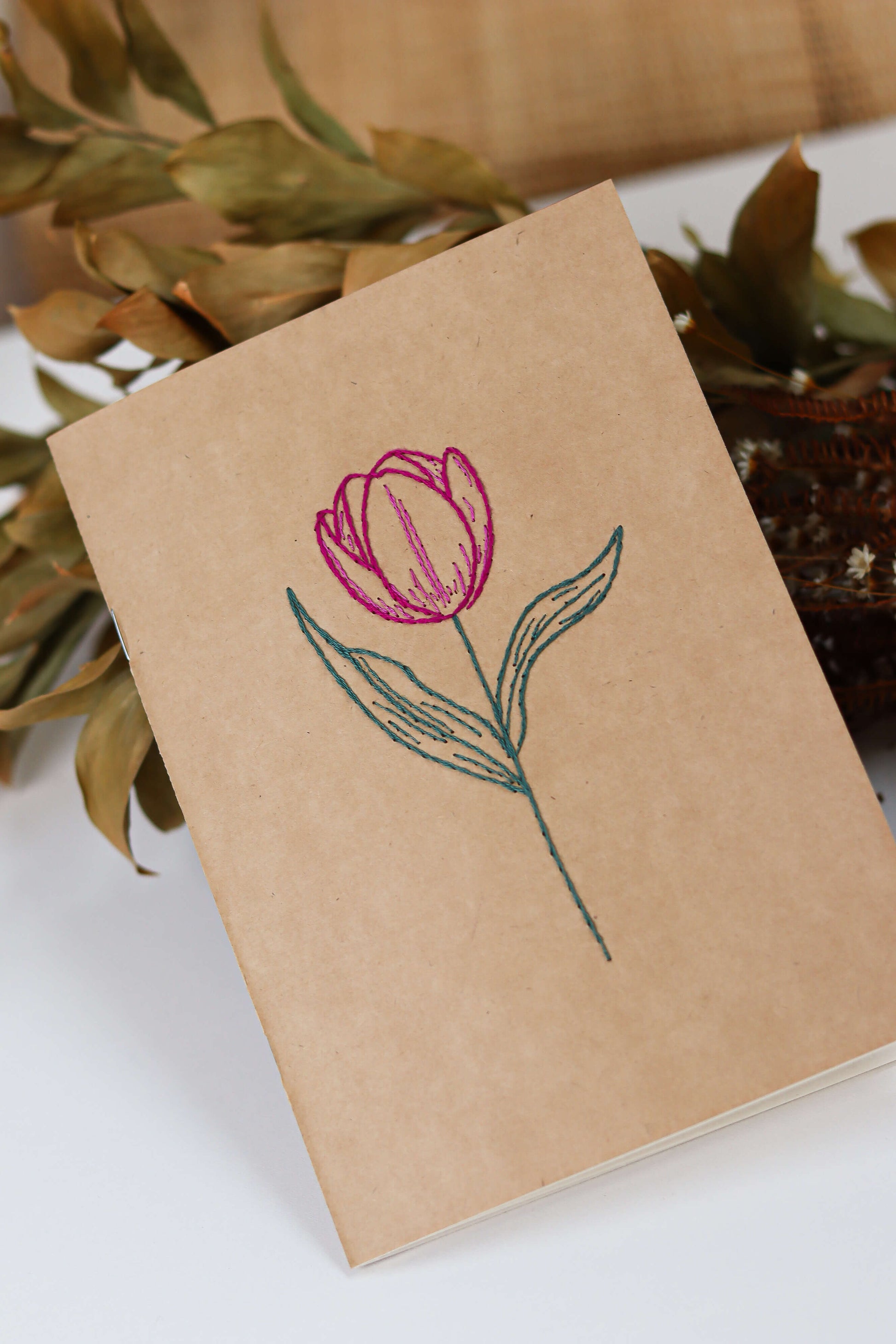 Neste kit, o bordado ganha o papel como base: uma caderneta kraft A5 recebe uma tulipa bordada em tons de magenta, cor que representa sensibilidade e afeto.