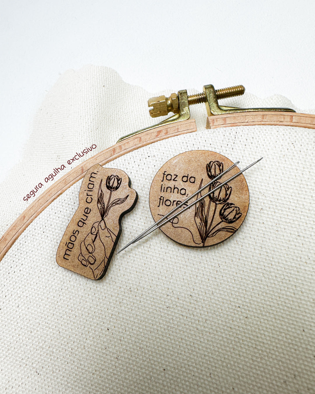 É apenas posicionado a parte ilustrada na frente do tecido e o magnético com o logotipo na parte de trás: sua agulha fica firme, visível e protegida.