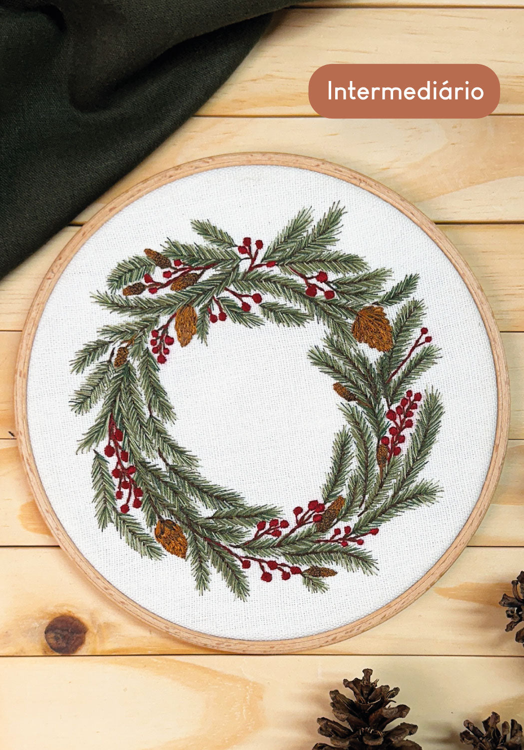Um projeto de nível intermediário, para quem deseja se aprofundar nas combinações de pontos e explorar texturas que encantam. A Guirlanda de Natal é um risco clássico, que une beleza e simbologia. Um bordado que traz para o presente a memória e a ternura dessa época.