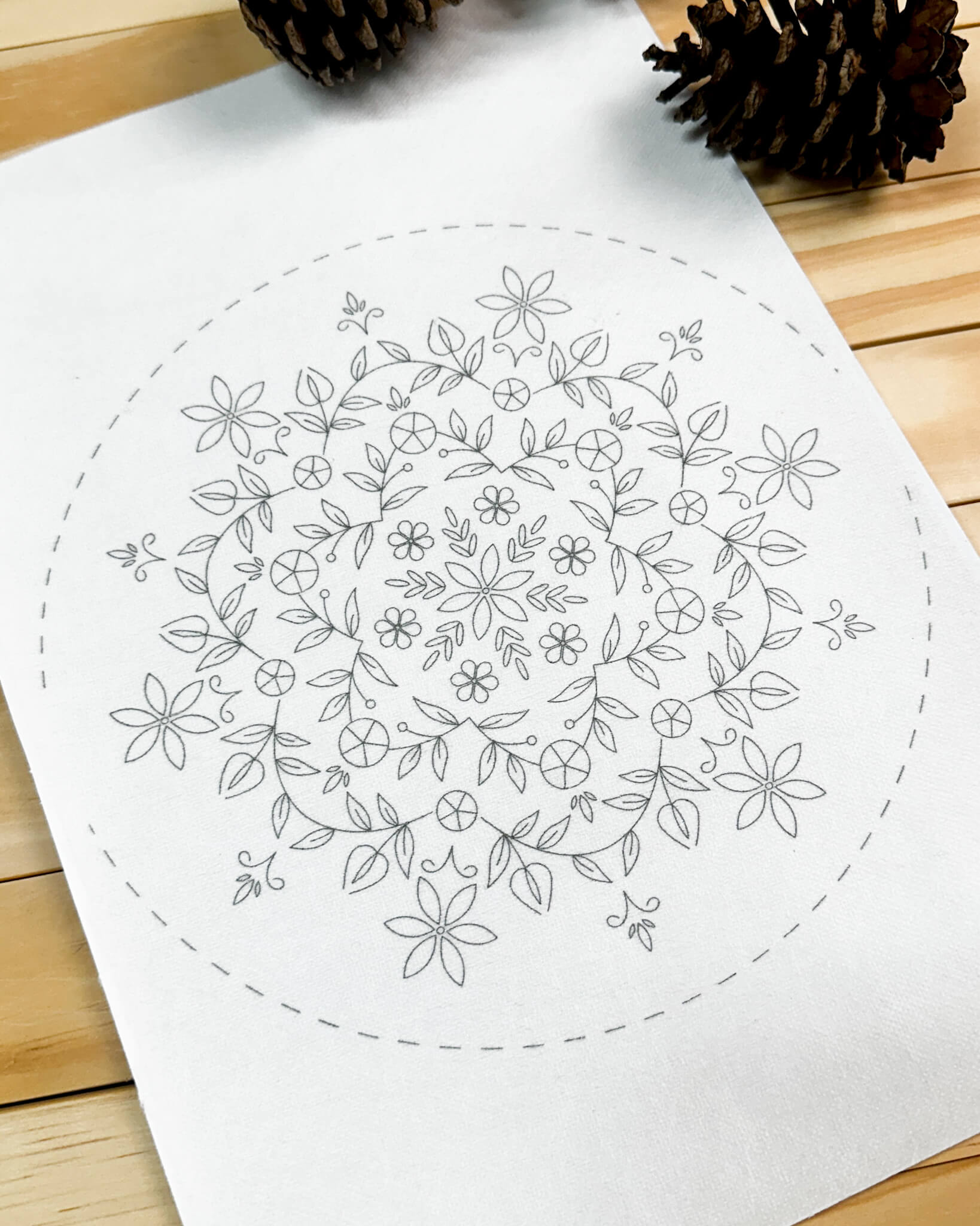 Este kit contém uma folha única de entretela adesiva hidrossolúvel, com um risco para bastidor de 20cm com uma composição floral geométrica.
