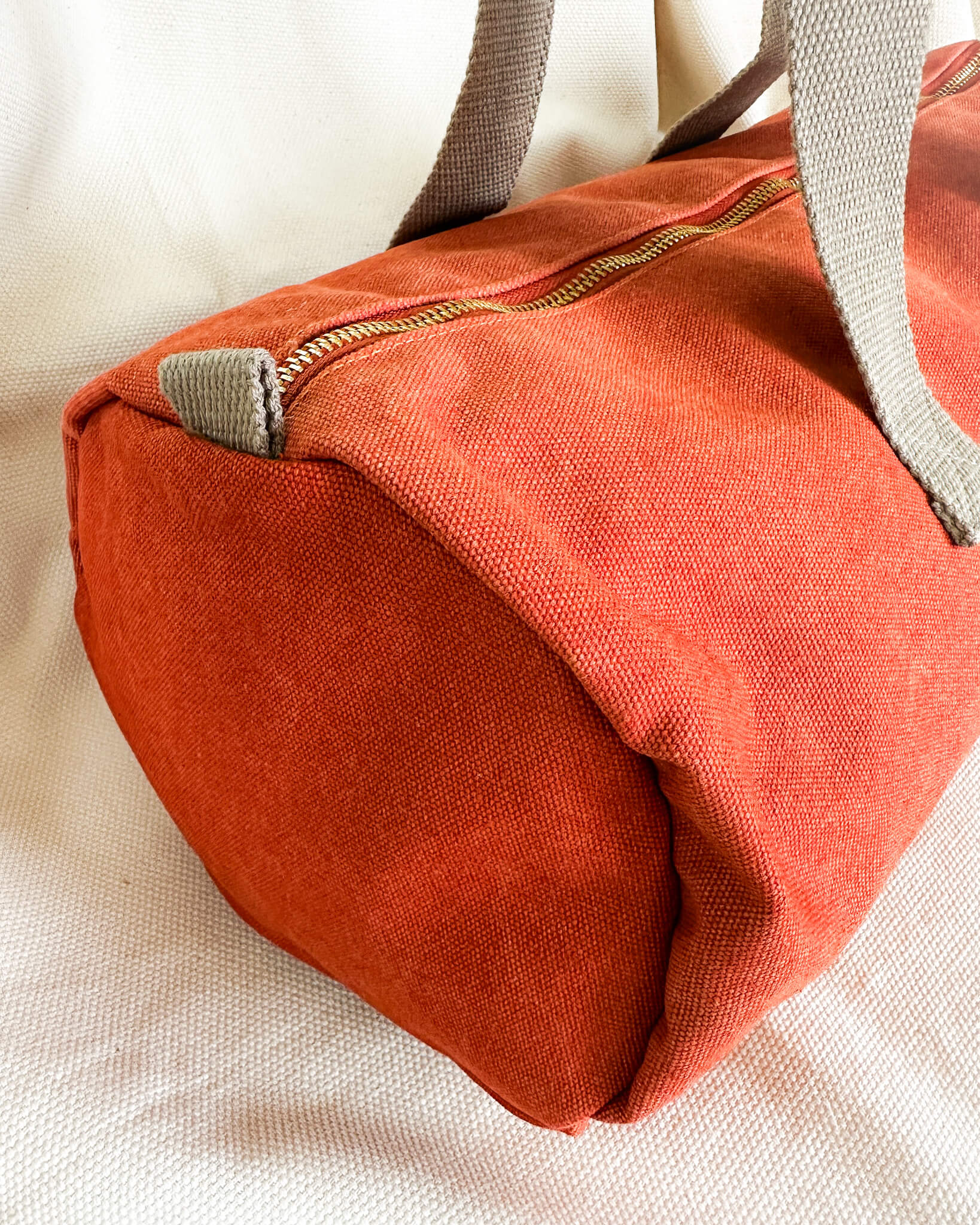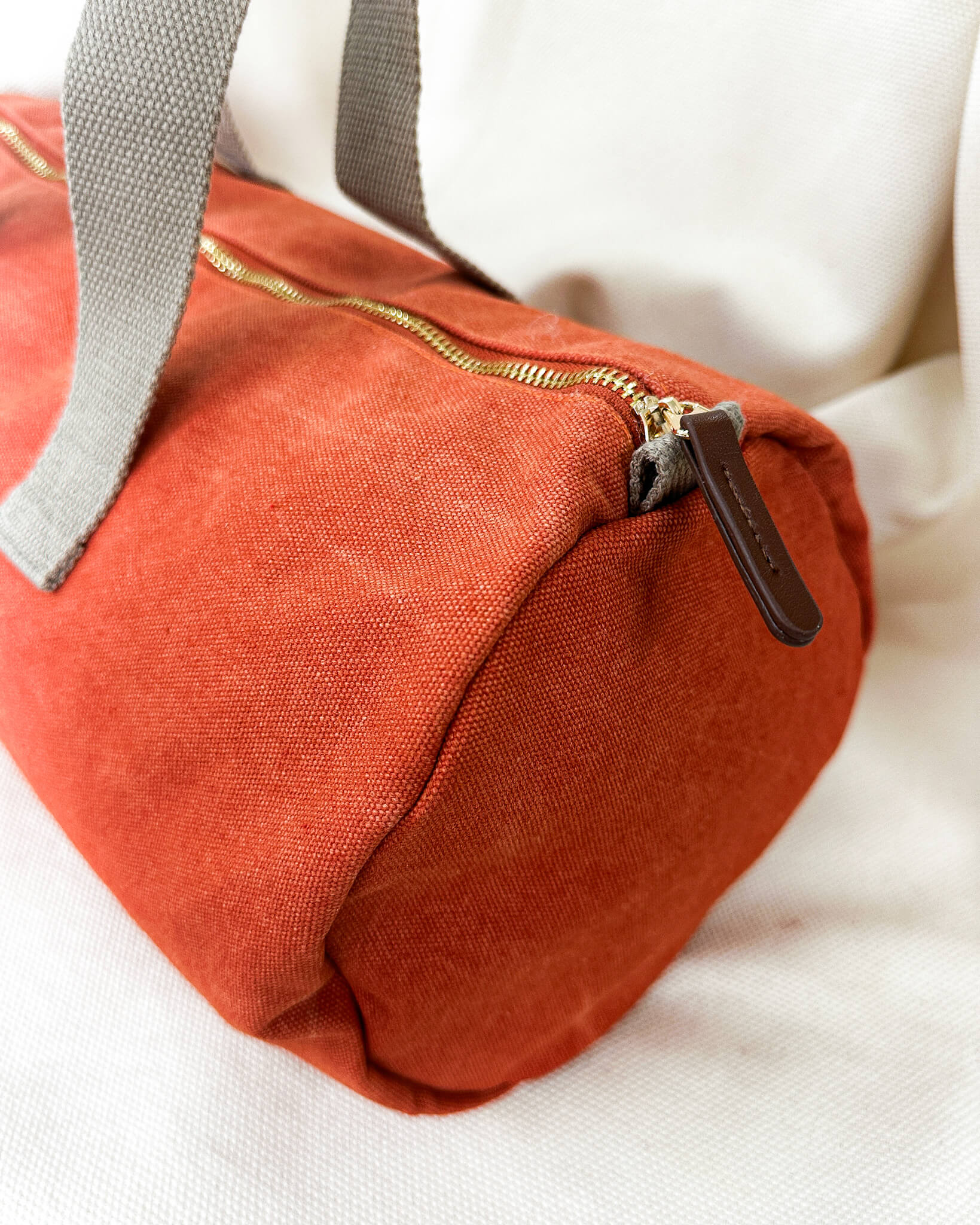 A lona reciclada traz durabilidade e compromisso com o planeta, sendo certificada pelo Global Recycle Standard (GRS). O tom terracota destaca o design e traz um ar acolhedor, finalizado pela etiqueta em couro sintético com o logo Eco Vita em relevo.