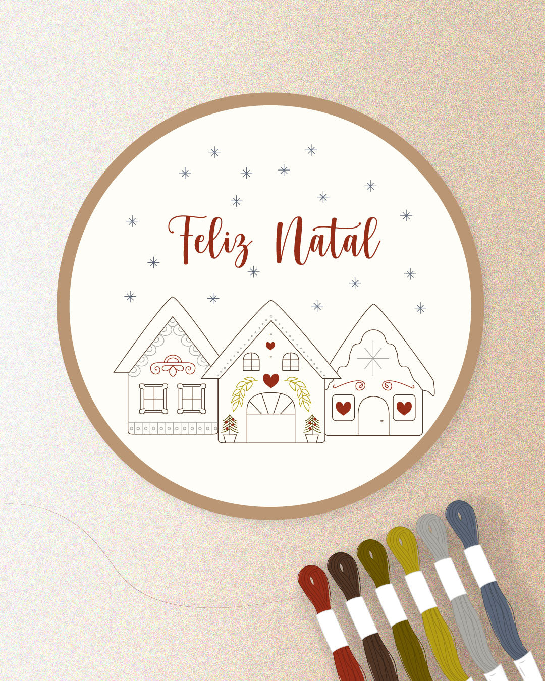 A paleta Calma mistura marrom terroso, laranja queimado, verdes discretos e azuis suaves. Cuidadosamente selecionada para acolher, aquecer e trazer tranquilidade enquanto você borda cada ponto com atenção e cuidado.