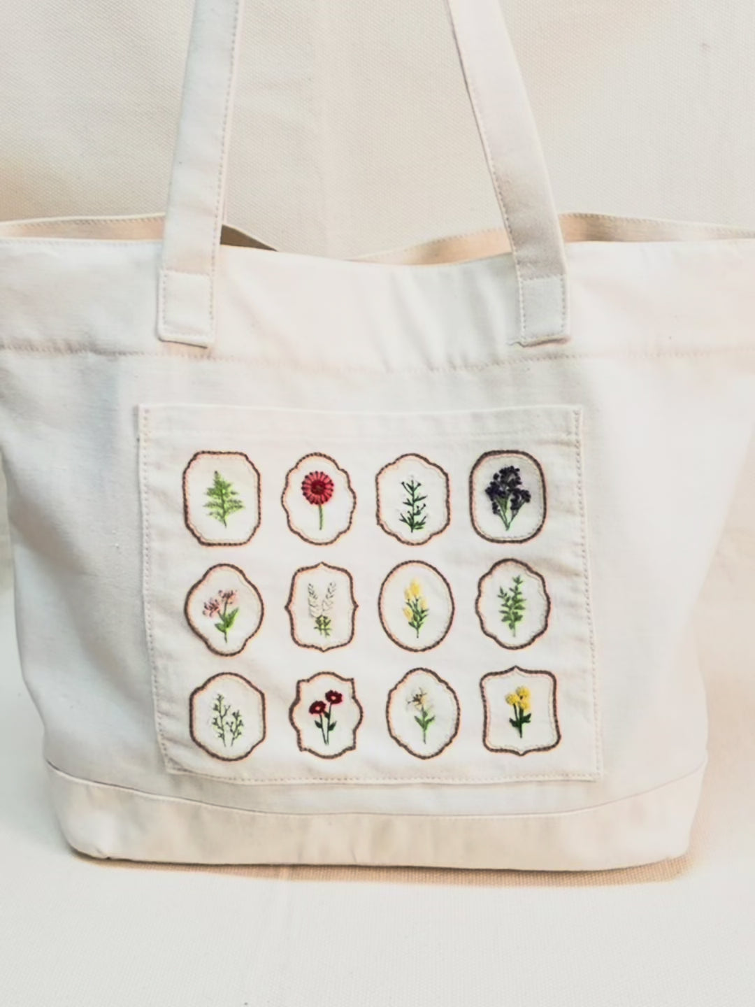 E para deixar uma peça ainda mais especial, acompanha um bolso extra de tecido (14,5 x 9,5 cm) para você bordar e costurar na parte externa da bolsa — um detalhe funcional que também se torna expressão de sua arte.